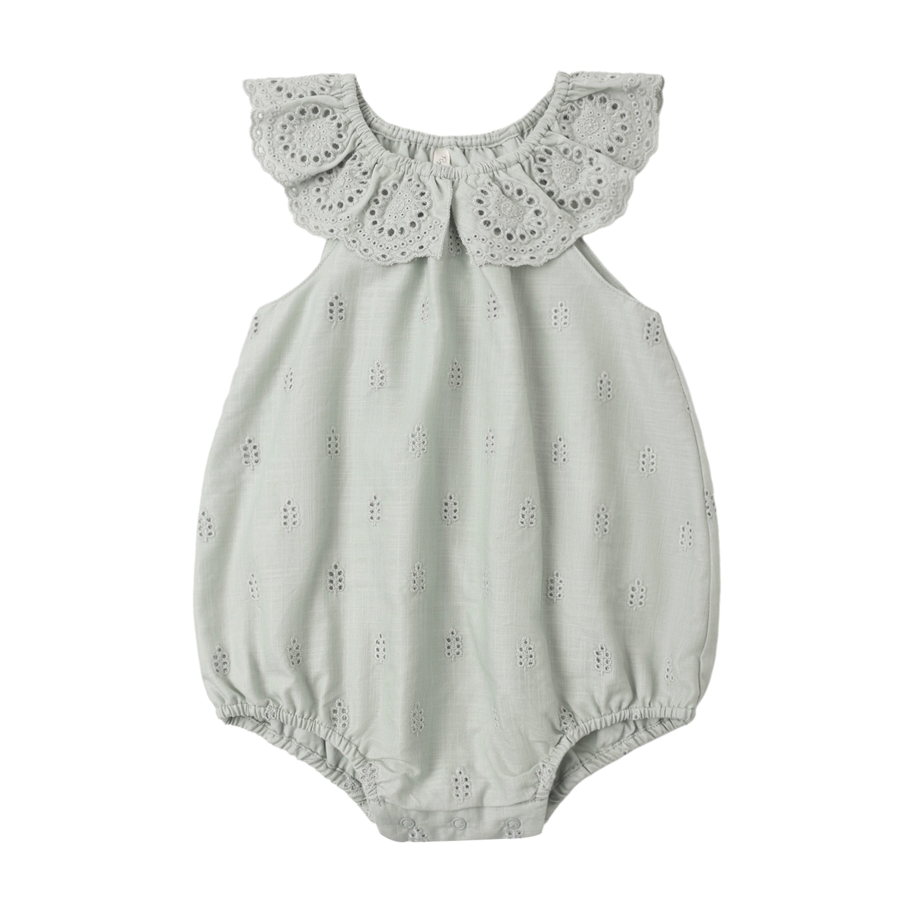 This beautiful eyelet romper is a sure summer staple for your little ones. With a sweet ruffle collar and bottom snaps for easy wear.